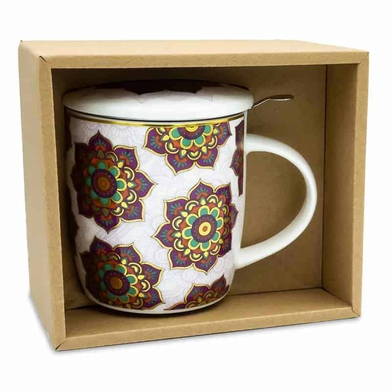 Cană de ceai colorată, cu capac și infuzor din oțel inoxidabil, fabricată din porțelan de os și ambalată într-o cutie de cadou din carton.