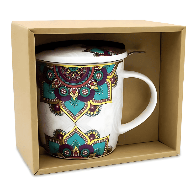 Descoperă Ceașca pentru Ceai Mandala Turcoaz, care combină funcționalitatea cu un design elegant. Fabricată din porțelan de os de înaltă calitate, această ceașcă este perfectă pentru momentele tale de relaxare. Designul vibrant, cu motive mandala în nuanțe de turcoaz, violet, roșu și galben, adaugă un strop de artă în ritualul tău de ceai.