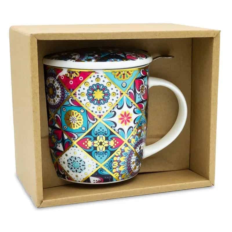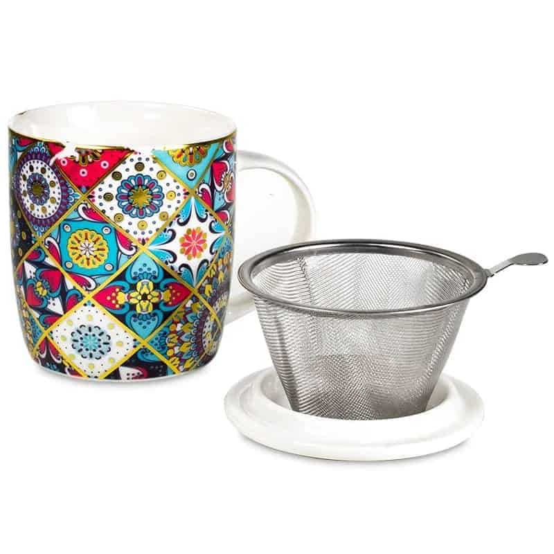 Această cană elegantă pentru ceai, cu un design oriental vibrant, este perfectă pentru cei care apreciază atât estetică, cât și funcționalitate. Împreună cu capacul și infuzorul incluse, este ideală pentru prepararea și savurarea ceaiurilor preferate.